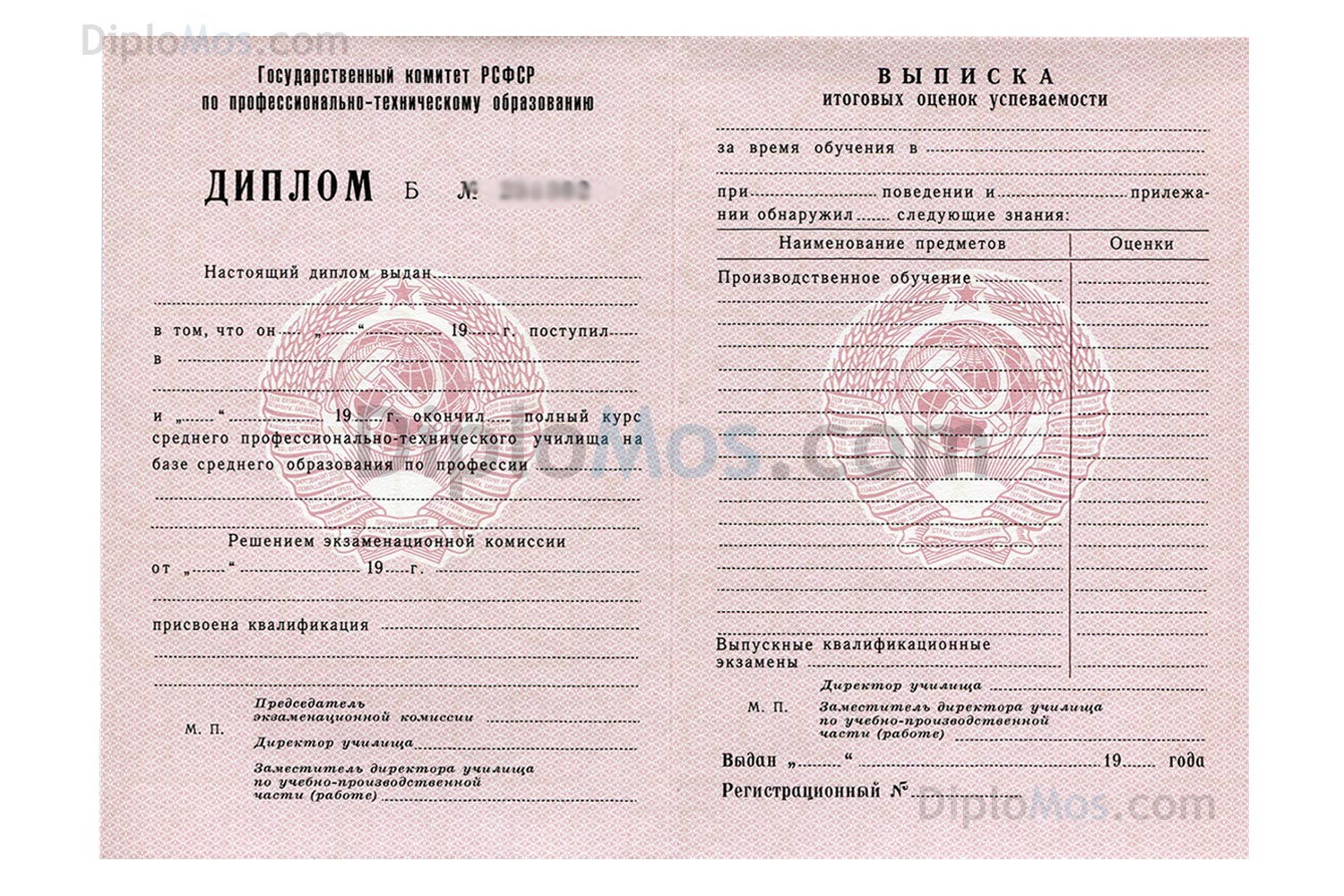 Ищете, где купить диплом училища (ПТУ) или лицея (ПТЛ) в Москве? Предлагаем Вам настоящие государственные документы на подлинных бланках. Гарантируем: срочное изготовление; бесплатную доставку курьером за 24 часа; оплату при получении; только настоящие государственные бланки; заполнение как в учебных заведениях. ВНИМАНИЕ! Согласно новому закону «Об образовании» с 2014 года все училища России выдают дипломы о среднем образовании квалифицированного рабочего (служащего), поэтому бланки совпадают с дипломами техникумов.